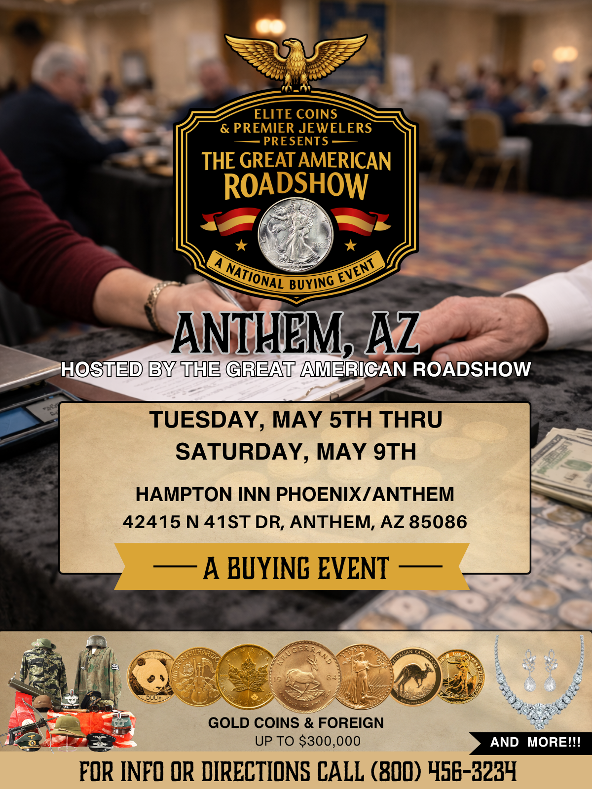The Anthem Roadshow Event is a free buying event where guests can bring valuable items, such as coins, gold, silver, jewelry, collectibles, and memorabilia, for on-site expert evaluation and immediate purchase offers. Hosted by The Great American Roadshow, the event runs May 5th - 9th, 2026. Visitors receive transparent evaluations, same-day payments, and opportunities to enter exclusive giveaways.