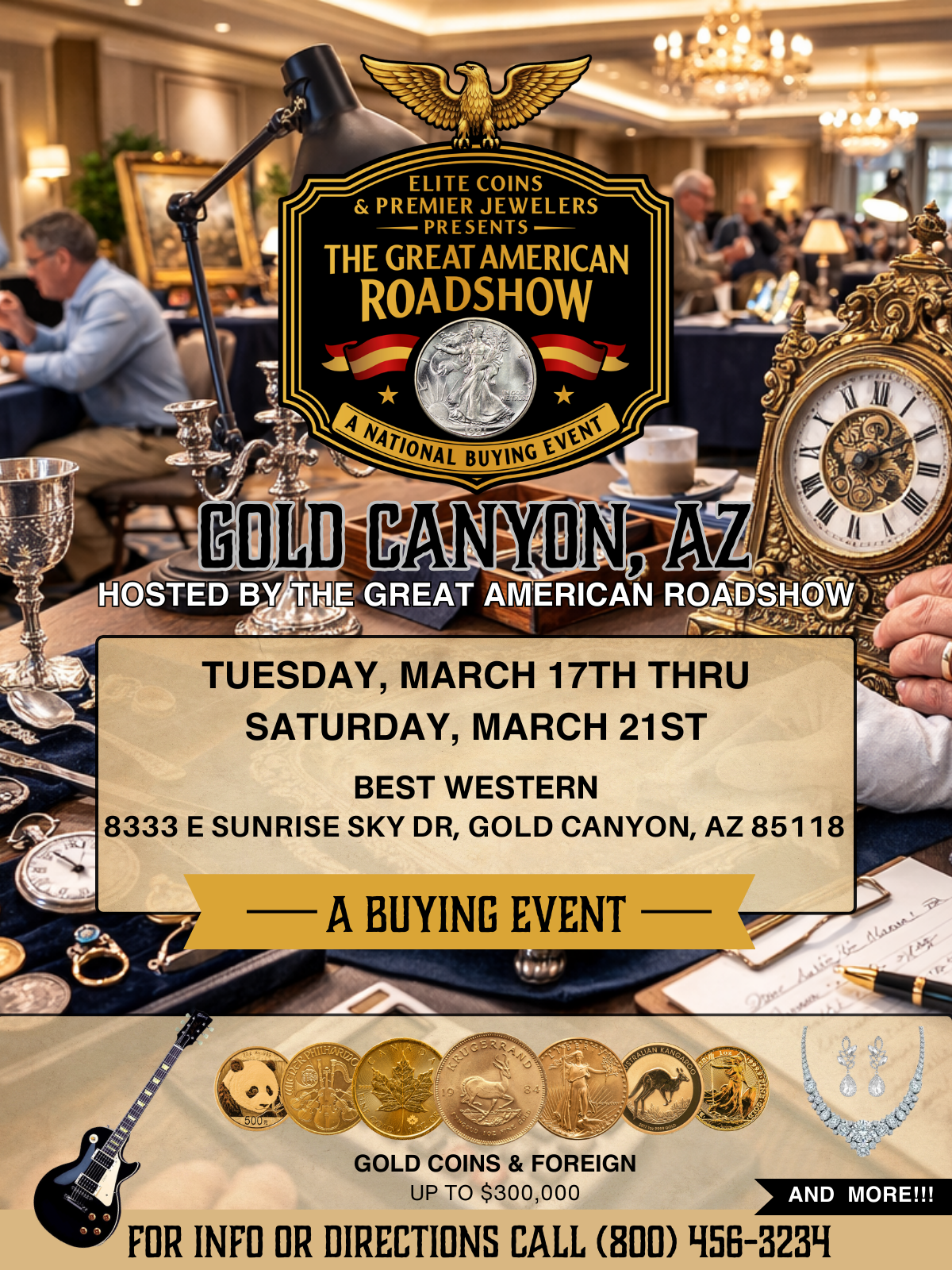 The Gold Canyon Roadshow event is a free, in-person buying event where guests are invited to bring valuable items—such as gold, silver, coins, jewelry, antiques, collectibles, and memorabilia—for professional, on-site evaluation and transparent appraisal by experienced buyers. At the event, specialists assess your items based on market value, explain each appraisal, and make no-pressure offers you can accept if you choose. Offers are made on the spot with same-day payment, and all evaluations are completely free. Guests may also have the opportunity to enter exclusive giveaways during the event as a thank-you for participating.