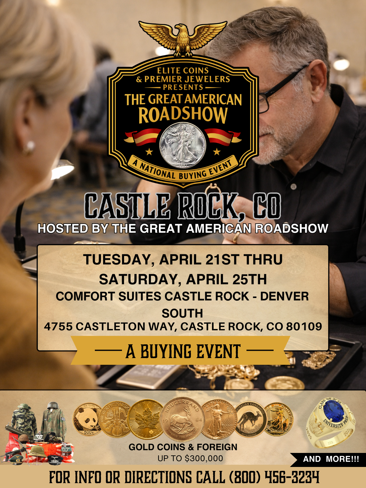 The Castle Rock Roadshow Event is a free buying event where guests can bring valuable items, such as coins, gold, silver, jewelry, collectibles, and memorabilia, for on-site expert evaluation and immediate purchase offers. Hosted by The Great American Roadshow, the event runs April 21st- 25th, 2026. Visitors receive transparent evaluations, same-day payments, and opportunities to enter exclusive giveaways.