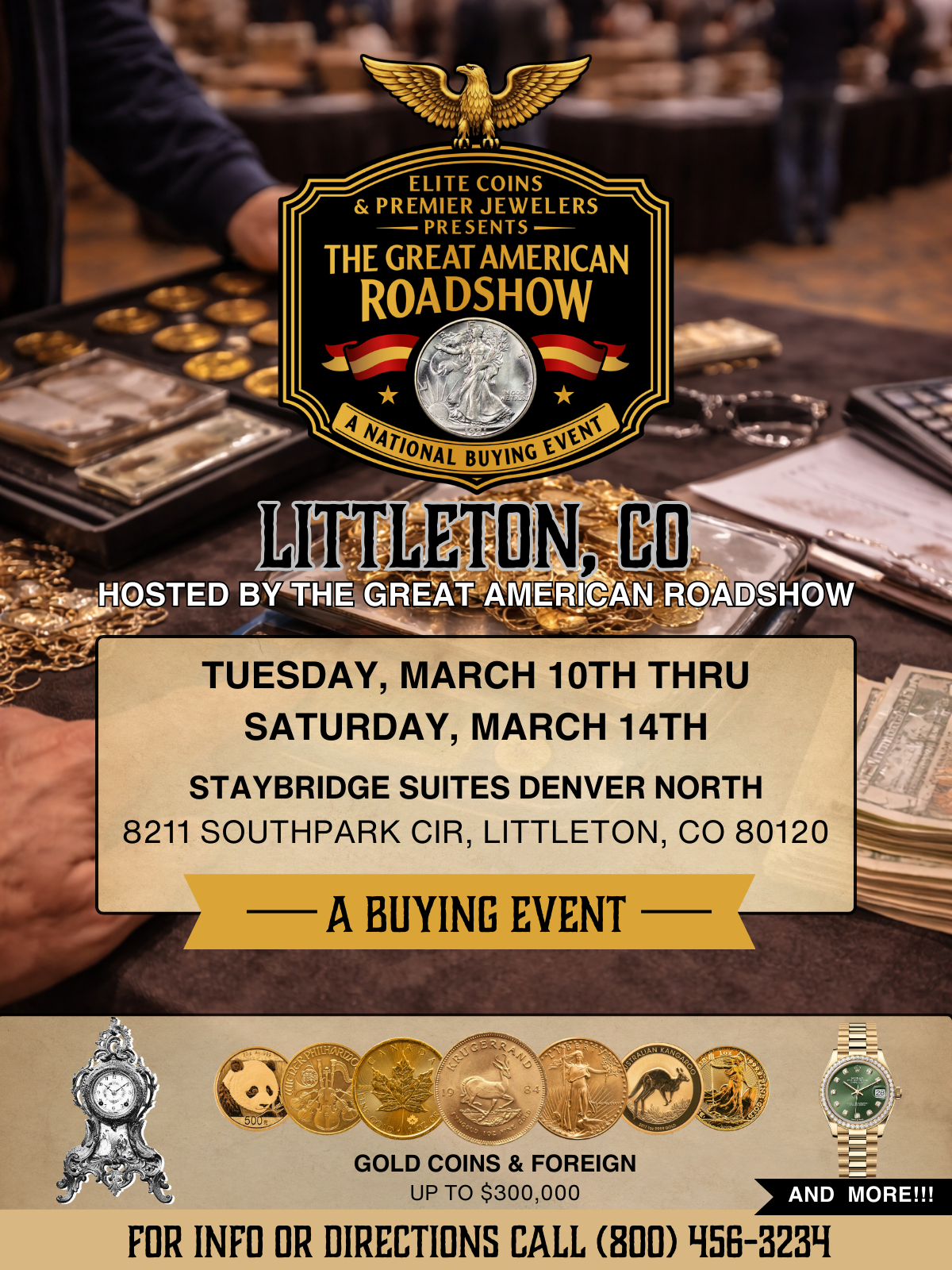 The Littleton Roadshow event is a free, in-person buying event where guests are invited to bring valuable items—such as gold, silver, coins, jewelry, antiques, collectibles, and memorabilia—for professional, on-site evaluation and transparent appraisal by experienced buyers. At the event, specialists assess your items based on market value, explain each appraisal, and make no-pressure offers you can accept if you choose. Offers are made on the spot with same-day payment, and all evaluations are completely free. Guests may also have the opportunity to enter exclusive giveaways during the event as a thank-you for participating.