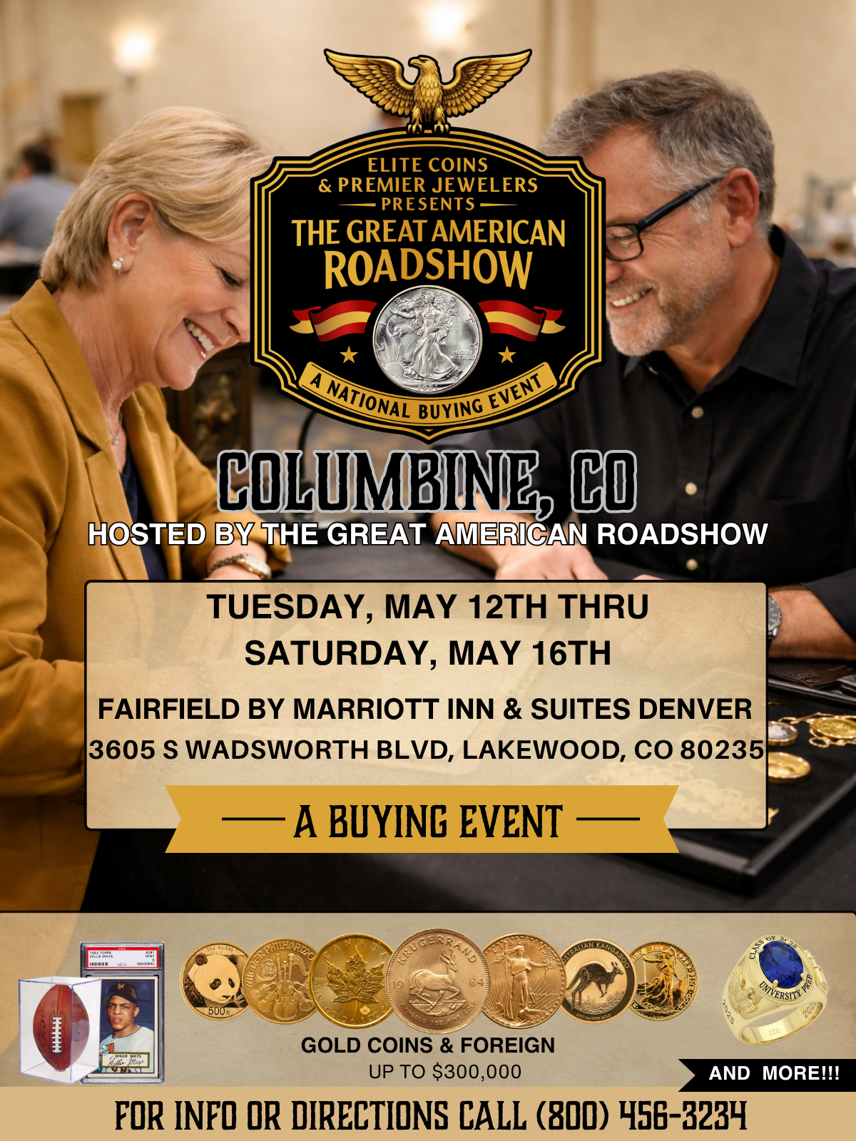 The Columbine Roadshow Event is a free buying event where guests can bring valuable items, such as coins, gold, silver, jewelry, collectibles, and memorabilia, for on-site expert evaluation and immediate purchase offers. Hosted by The Great American Roadshow, the event runs May 12th - 16th, 2026. Visitors receive transparent evaluations, same-day payments, and opportunities to enter exclusive giveaways.
