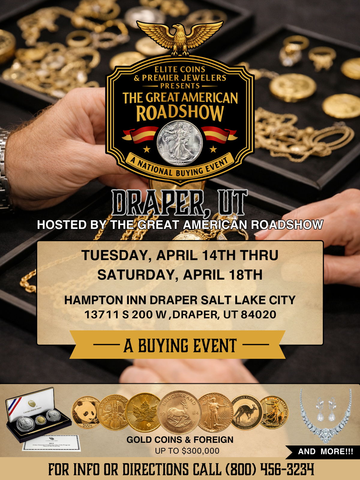 The Draper Roadshow Event is a free buying event where guests can bring valuable items, such as coins, gold, silver, jewelry, collectibles, and memorabilia, for on-site expert evaluation and immediate purchase offers. Hosted by The Great American Roadshow, the event runs April 14th - 18th, 2026. Visitors receive transparent evaluations, same-day payments, and opportunities to enter exclusive giveaways.
