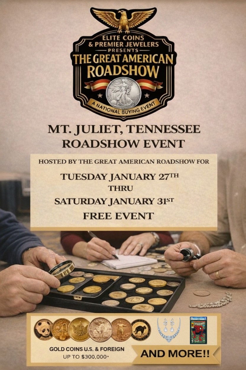 The Mt. Juliet Roadshow Event is a free buying event where guests are invited to bring valuable items—such as coins, gold, silver, jewelry, collectibles, and memorabilia—for on-site expert evaluation and immediate purchase offers. Hosted by The Great American Roadshow, the event runs January 27–31 in Mt. Juliet, Tennessee. Attendees can expect honest, transparent appraisals, same-day payments, and the opportunity to enter exclusive giveaways.