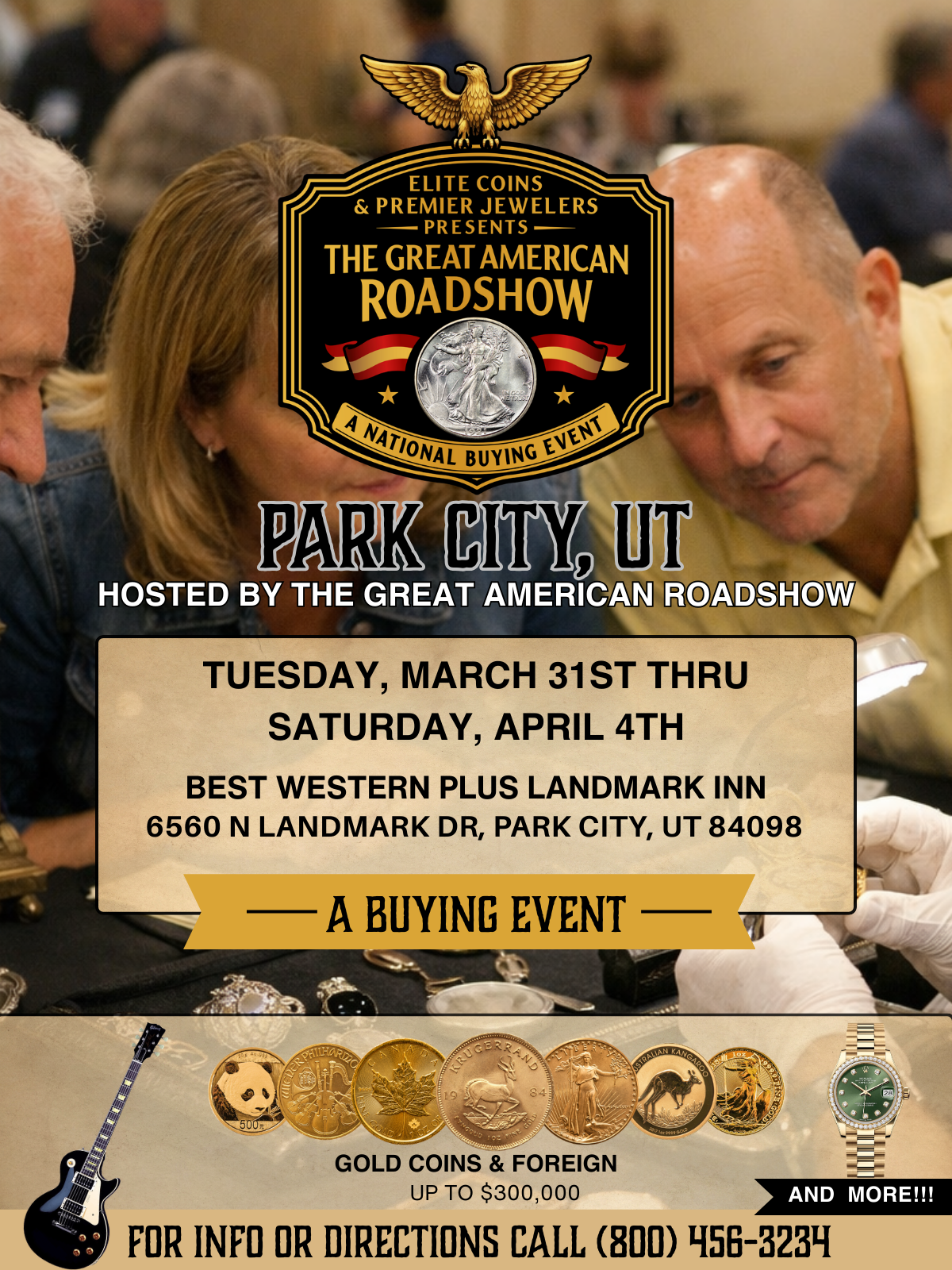 The Park City Roadshow Event is a free buying event where guests can bring valuable items, such as coins, gold, silver, jewelry, collectibles, and memorabilia, for on-site expert evaluation and immediate purchase offers. Hosted by The Great American Roadshow, the event runs March 31st –April 4th, 2026. Visitors receive transparent evaluations, same-day payments, and opportunities to enter exclusive giveaways.