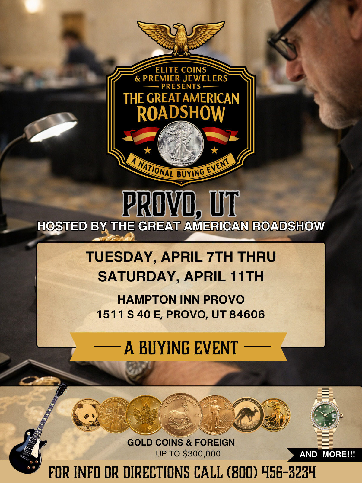 The Provo Roadshow Event is a free buying event where guests can bring valuable items, such as coins, gold, silver, jewelry, collectibles, and memorabilia, for on-site expert evaluation and immediate purchase offers. Hosted by The Great American Roadshow, the event runs April 7th - 11th, 2026. Visitors receive transparent evaluations, same-day payments, and opportunities to enter exclusive giveaways.