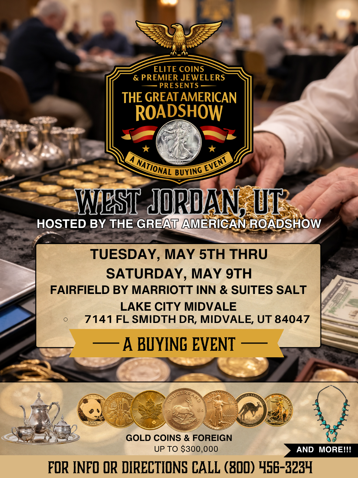 The West Jordan Roadshow Event is a free buying event where guests can bring valuable items, such as coins, gold, silver, jewelry, collectibles, and memorabilia, for on-site expert evaluation and immediate purchase offers. Hosted by The Great American Roadshow, the event runs May 5th - 9th, 2026. Visitors receive transparent evaluations, same-day payments, and opportunities to enter exclusive giveaways.
