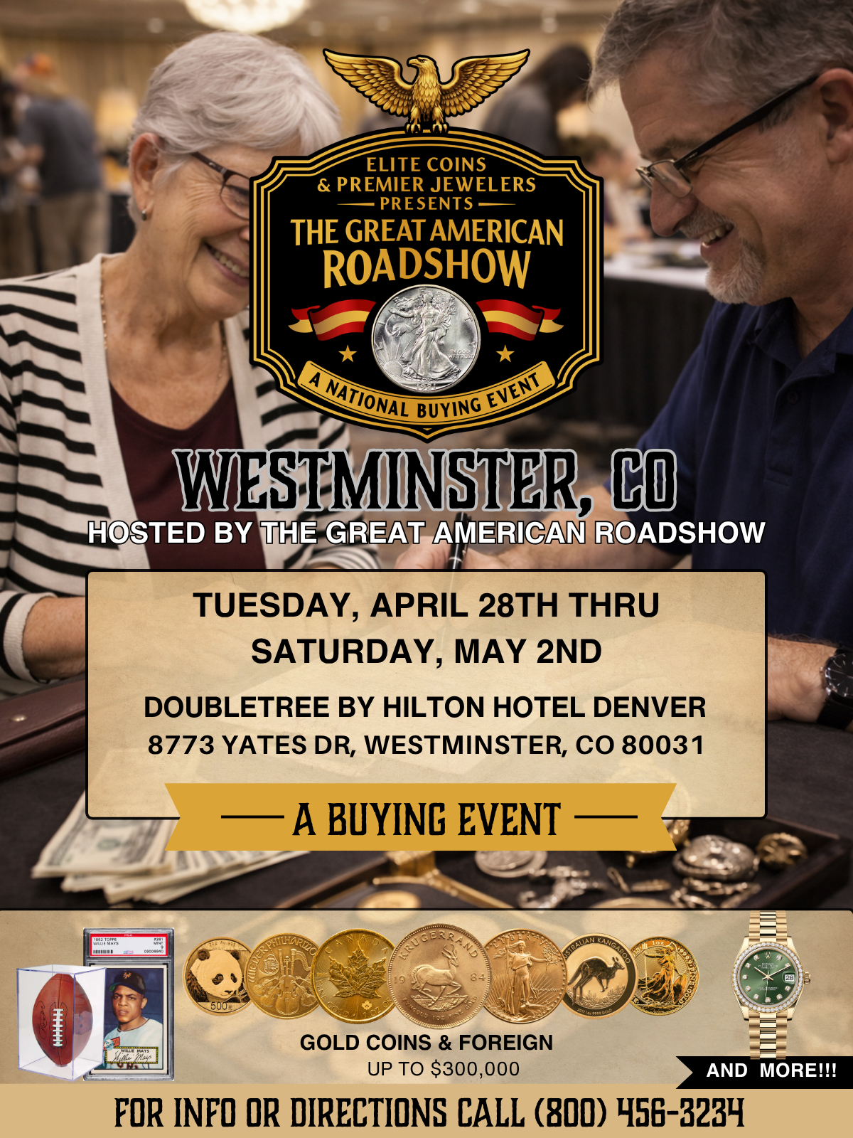 The Westminster Roadshow Event is a free buying event where guests can bring valuable items, such as coins, gold, silver, jewelry, collectibles, and memorabilia, for on-site expert evaluation and immediate purchase offers. Hosted by The Great American Roadshow, the event runs April 28th - May 2nd, 2026. Visitors receive transparent evaluations, same-day payments, and opportunities to enter exclusive giveaways.