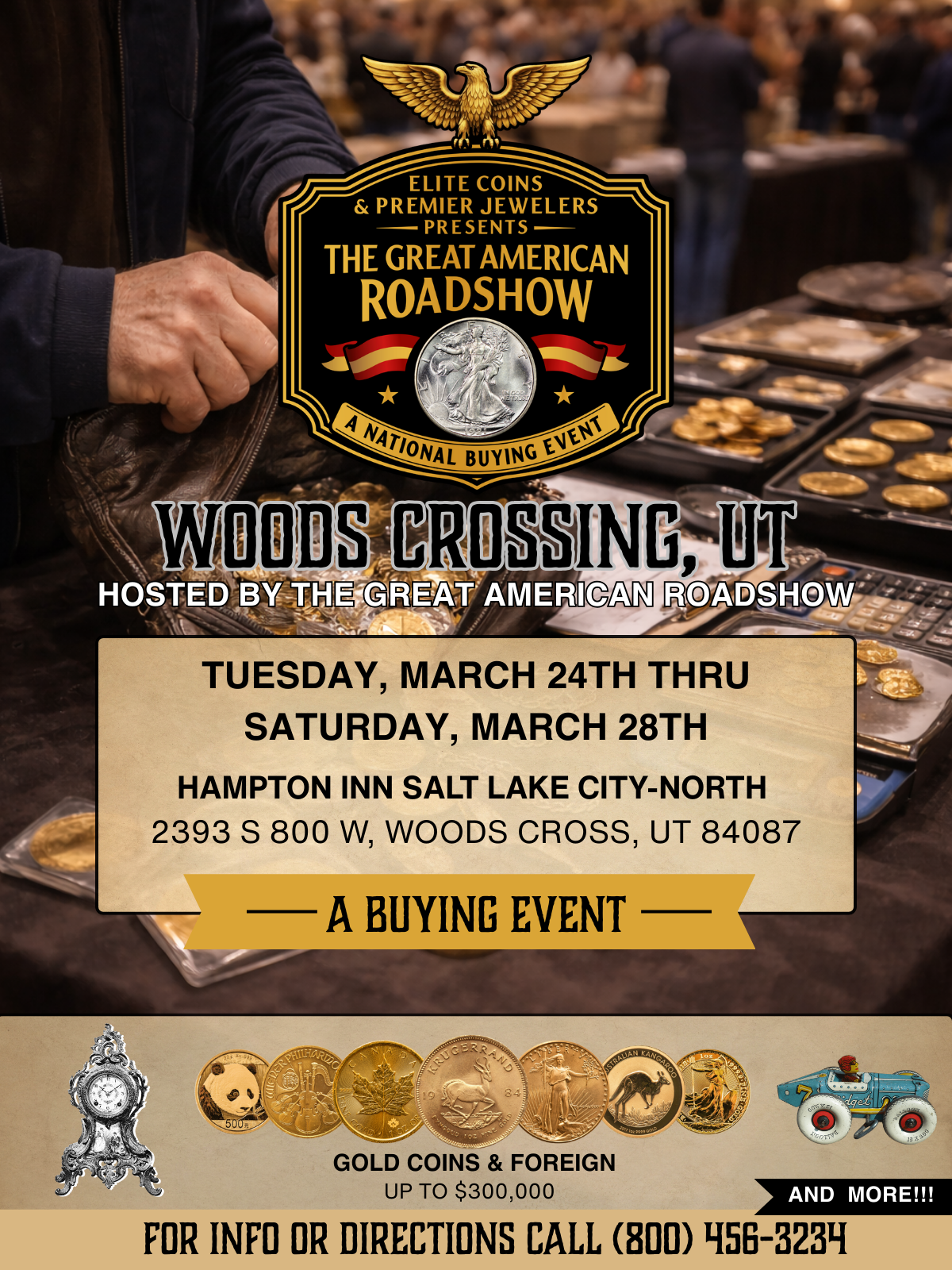The Woods Cross Roadshow Event is a free buying event where guests can bring valuable items, such as coins, gold, silver, jewelry, collectibles, and memorabilia, for on-site expert evaluation and immediate purchase offers. Hosted by The Great American Roadshow, the event runs March 24th - 28th, 2026. Visitors receive transparent evaluations, same-day payments, and opportunities to enter exclusive giveaways.